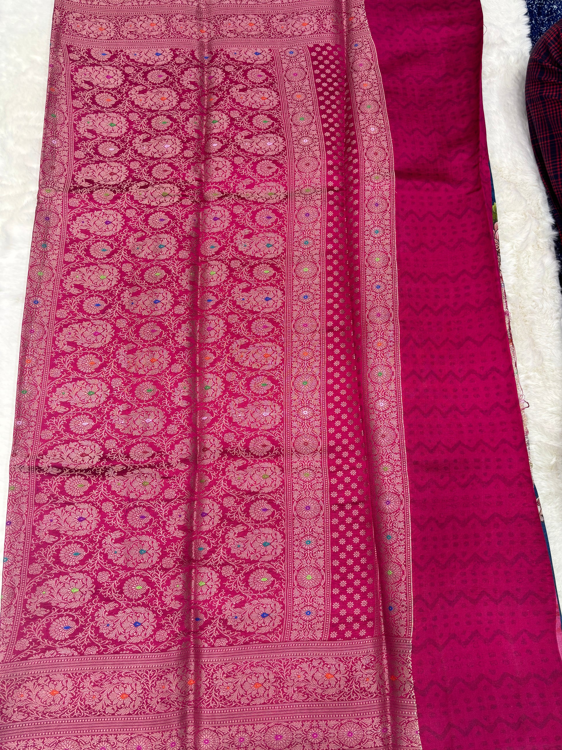 Munga silk sarees featuring Banaras weaving and a Paithani border are a wonderful example of textile fusion, blending three distinct and celebrated Indian weaving traditions into a single piece of fabric.